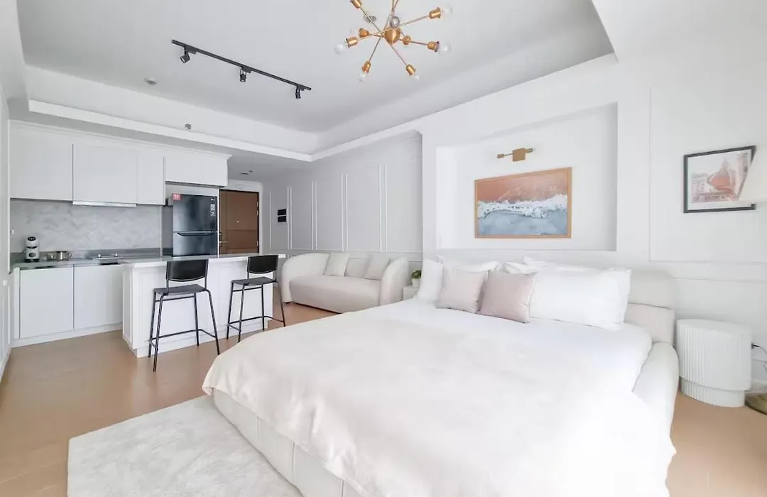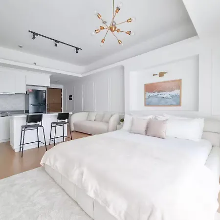 屋内プールを提供する寝室1室のKing Bed, Washer, Air Dry, Sauna, Gym & Pool Access, Fast Wi-Fi, Elegant Studio, Near Venice Grand Canal Mall, Walking Distance Britsh Embassy, 5 Min Drive To Bgc, 10 Min Drive To Manila Airport Naia 3は、リゾーツ・ワールド・マニラから3.5kmに位置しています。 40m²のアパートはマニラ・アメリカ軍記念墓地から徒歩で20分で、Enderun Collegesバス停とても近くです。